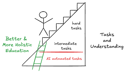 The future of work presents a paradox: while AI can handle increasingly complex tasks, developing the human expertise to manage, evaluate, and innovate beyond the AI requires a stronger foundation than ever. The traditional staircase is crumbling from the bottom, leaving a slippery AI Slide.